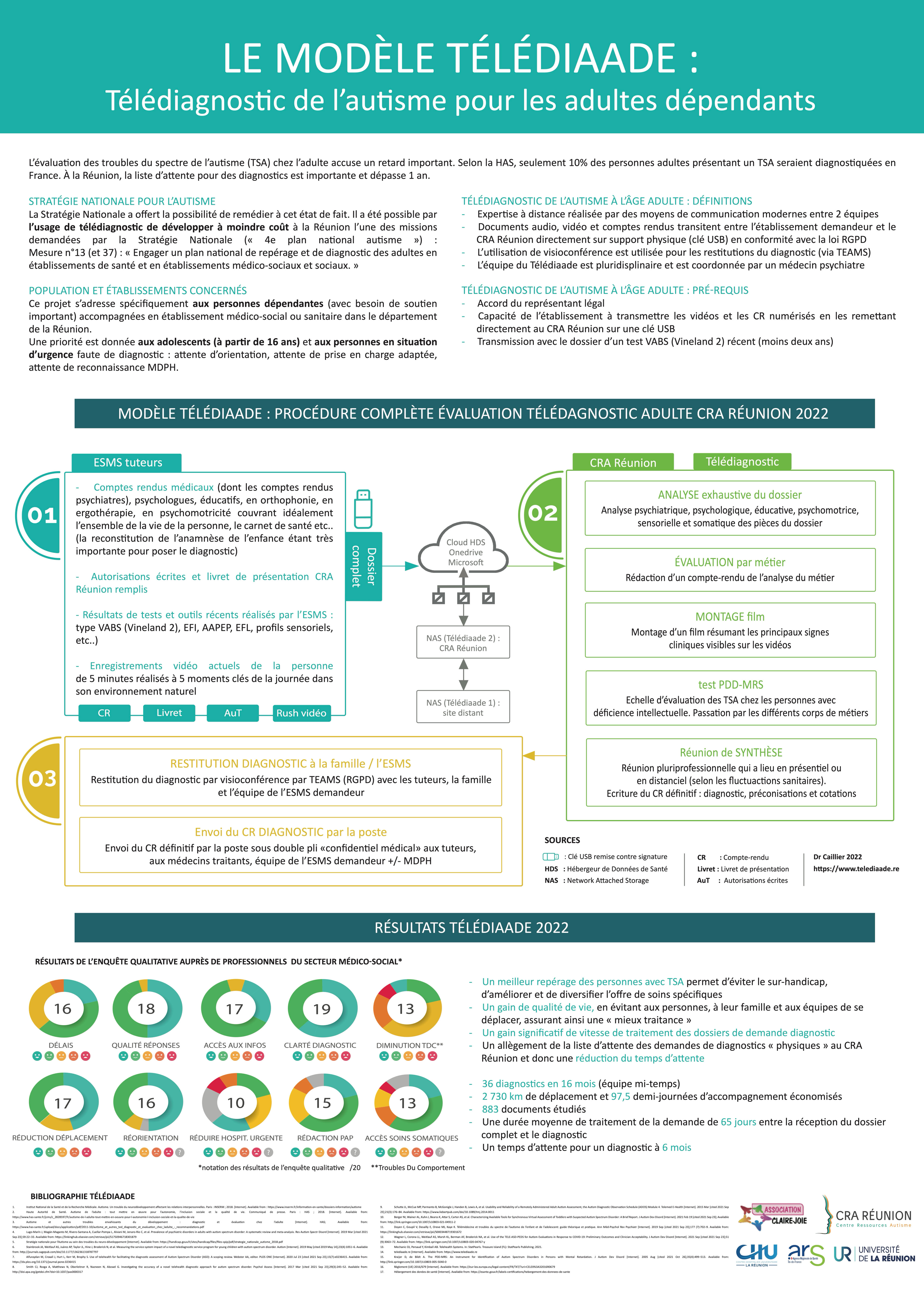 ▶︎Poster scientifique présenté au congrès international du GNCRA à Lyon en mai 2022: «Le modèle TéléDiAAde: télédiagnostic de l’autisme pour les adultes dépendants»